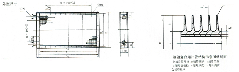 外徑D(mm) | 翅片高度h(mm) | 翅片厚度s(mm) | 翅片節距t(mm) | 鋁管壁厚h(mm) | 鋼管壁厚h(mm) | 總外表面積Sw(m²/m) |